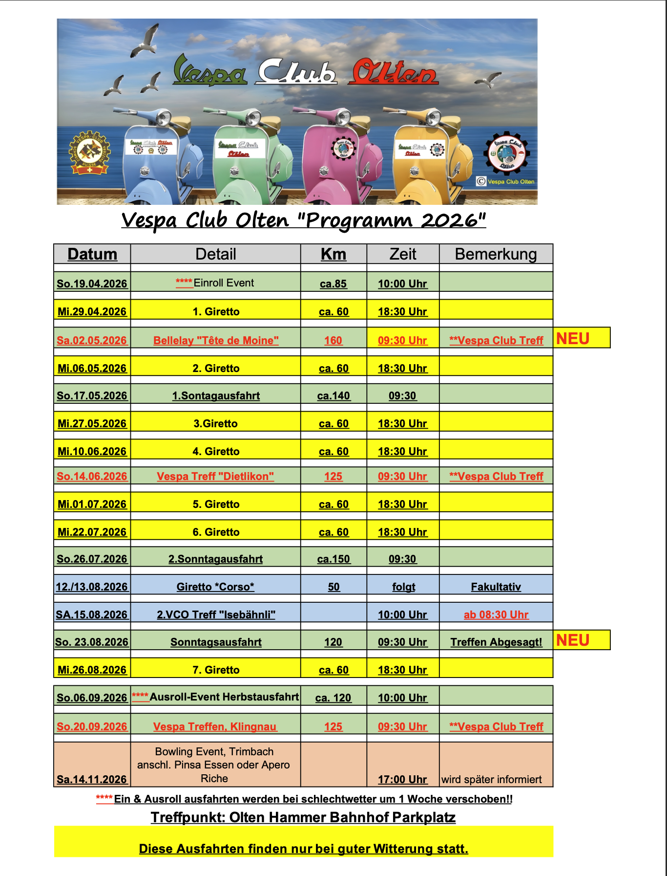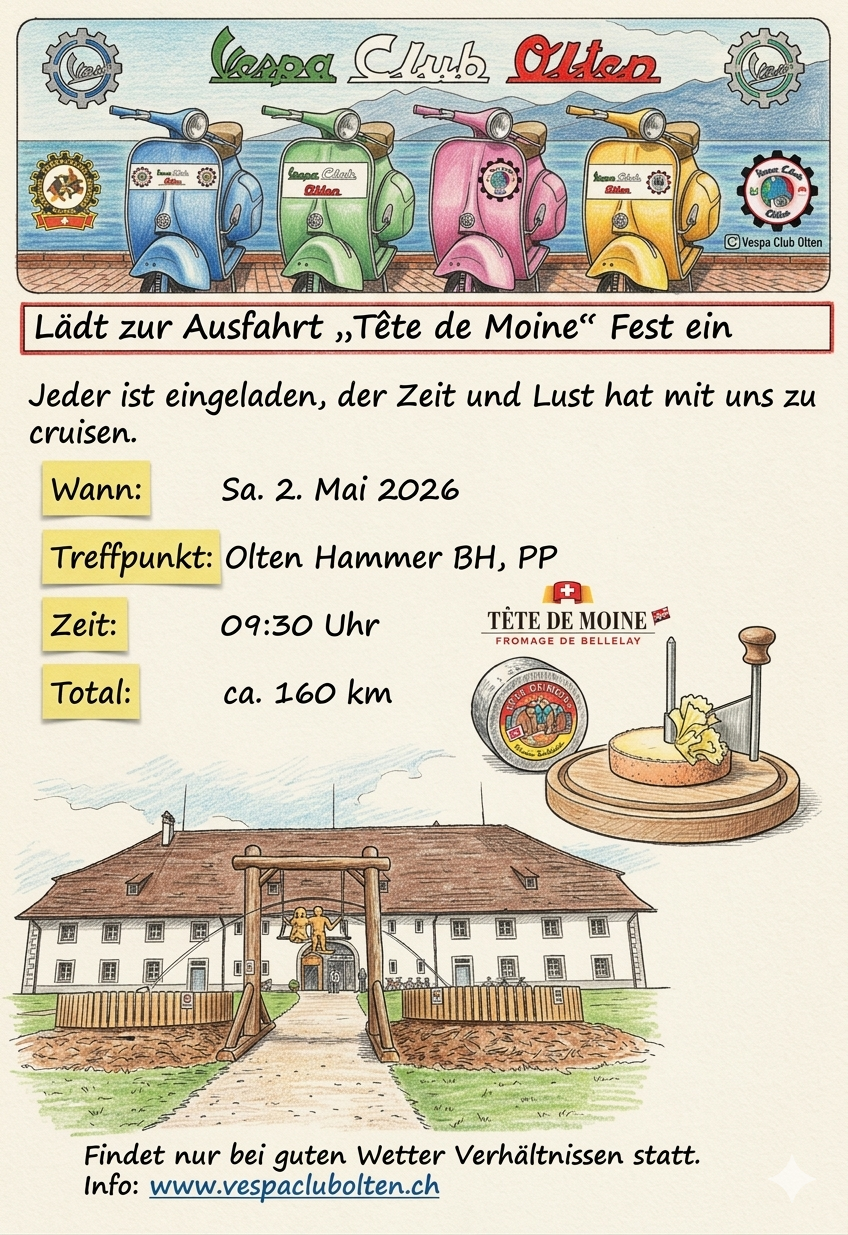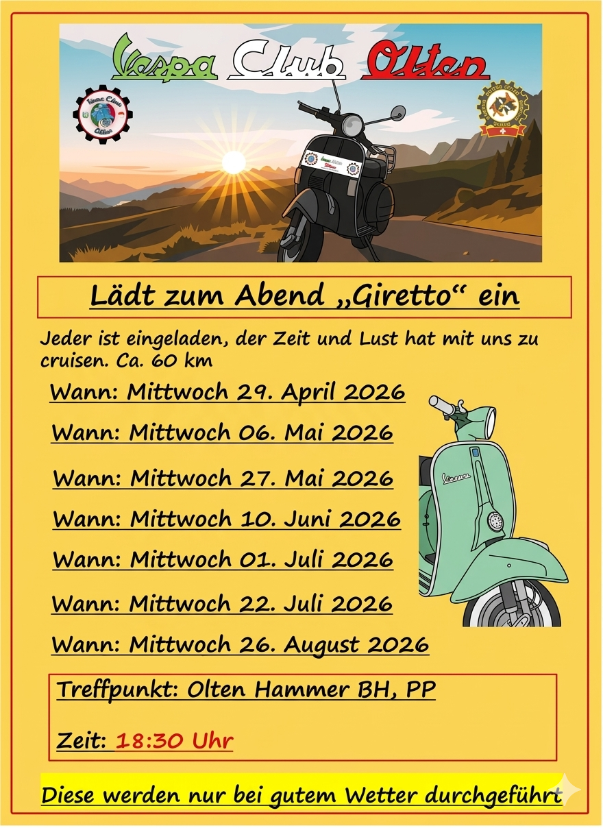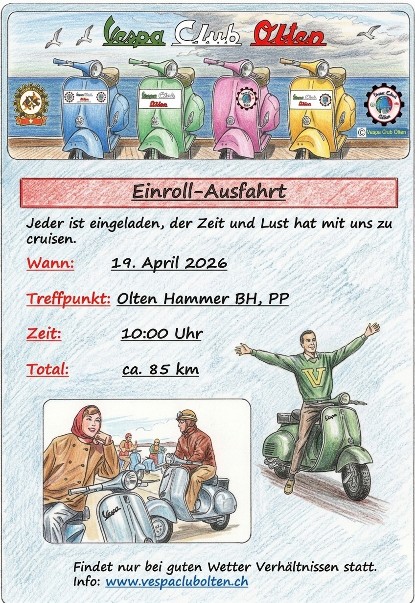 Wir eröffnen offiziell am 19. April die Saison 2026 und holen unsere Vespas aus dem Winterschlaf! Gemeinsam stimmen wir uns auf eine unvergessliche Ausfahrtsaison ein und geniessen die ersten Kilometer des Jahres. Unsere Route führt uns durch die Kantone Solothurn (SO), Aargau (AG), Luzern (LU) und Bern (BE), mit abwechslungsreichen Strecken, schönen Landschaften und natürlich jeder Menge Fahrspass. Zum gemütlichen Abschluss lassen wir den Tag bei einem Erfrischungsgetränk im Kafi Dünnere in Wangen bei Olten ausklingen.